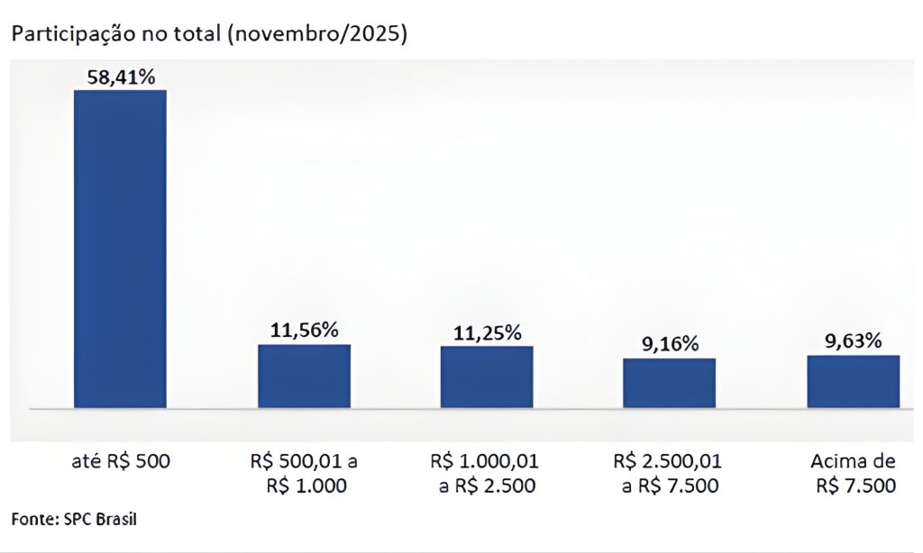 Em novembro de 2025, cada consumidor negativado devia, em média, R$ 4.781,98 na soma de todas as dívidas, distribuídas entre 2,23 empresas credoras. Quase três em cada dez inadimplentes (30,95%) têm pendências de até R$ 500, percentual que sobe para 43,97% quando se consideram dívidas de até R$ 1.000, mostrando que valores relativamente modestos permanecem em aberto por falta de folga financeira. No recorte por tipo de credor, os bancos concentram 65,24% das dívidas em atraso, à frente de contas de água e luz (10,79%) e do comércio (9,19%), o que revela sistema financeiro no centro do ciclo de inadimplência, ao mesmo tempo beneficiado por juros altos e pressionado por provisões crescentes.