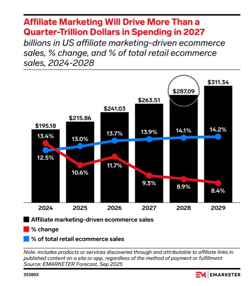 O BTG apontou, em relatório, o marketing de afiliados como a principal tendência global do e-commerce – que também começa a ganhar força também no Brasil. O documento usa os Estados Unidos como exemplo desse mercado e projeta que as vendas, originadas em canais de afiliados, devem ultrapassar US$ 287 bilhões até 2027 no país. Os dados são da empresa de pesquisa eMarketer. Crescimento exponencial – de quase 24 vezes –, visto que a projeção para 2025 é de US$ 12 bilhões. O documento evidencia que o modelo, impulsionado pela inteligência artificial, está deixando de ser um canal marginal de desempenho para se tornar peça central na jornada digital do consumidor brasileiro. Isso acontece à medida que assistentes de busca e recomendação com inteligência artificial passam a intermediar compras. No Brasil, pesquisa da Awin, uma das principais plataformas globais do setor, revelou que 45% dos lojistas nacionais utilizam programas de afiliados em alguma medida.
