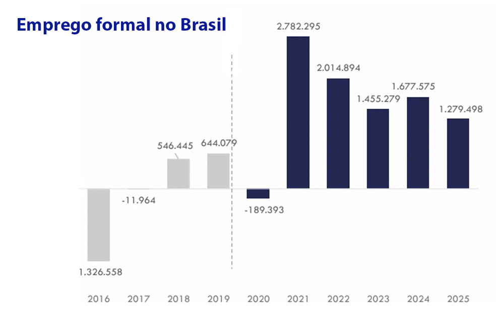 Somados todos os setores, o saldo no país em 2025 foi de 1,3 milhão de postos de trabalho com carteira, 23,7% menor que o do ano anterior (1,7 milhão). O saldo é resultado da diferença entre 26,6 milhões de admissões e 25,3 milhões de demissões. Apesar do crescimento constante desde 2021, foi a menor quantidade no período posterior ao da pandemia. Serviços (+3,3%) e construção (+3,1%) cresceram acima do comércio (+2,3%), que ficou à frente da indústria (+1,6%). O estoque de empregos formais agora é de 48,5 milhões, sendo 10,8 milhões (22,3%) no comércio. A atividade inclui varejo (7,4 milhões de vagas), atacado (2,2 milhões) e reparação de veículos (1,2 milhão).
