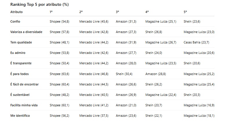 “Os três vetores centrais são digitalização, pragmatismo e pertencimento cultural”, afirmou Emília Rabello, fundadora e CEO do Nós. No estudo, 20 sites de compra de varejistas foram expostos em relação a dez atributos – Eu Confio, Valoriza a Diversidade, Tem Qualidade, Eu Admiro, É Transparente, É Fácil de Encontrar, É para Todos, É Sustentável, Facilita Minha Vida e Me Identifico. Em todos os recortes, a Shopee liderou, sempre tendo o Mercado Livre em segundo lugar e a Amazon em nove vezes em terceiro e uma em quarto lugar. As demais marcas que apareceram no Top 5 das dez categorias foram Magalu (dez vezes), Shein (nove vezes) e Casas Bahia (uma vez). Veja ao final o gráfico com o Top 5 das categorias.