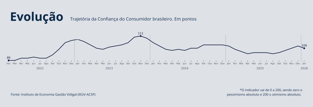 O Índice Nacional de Confiança (INC), da Associação Comercial de São Paulo (ACSP), recuou para 100 pontos em janeiro, o que indica neutralidade. Elaborada pela empresa PiniOn, a pesquisa do primeiro mês de 2026 interrompeu sequência de quatro altas seguidas. A queda foi de 2% na comparação mensal e anual. Índices abaixo de 100 indicam pessimismo e acima, otimismo. Segundo o economista Ulisses Ruiz de Gamboa, do Instituto de Economia Gastão Vidigal (IEGV-ACSP), o resultado reflete precaução do consumidor em relação a gastos.