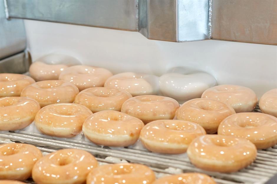 Na prática, os donuts são uma massa fermentada que passa por uma máquina pressurizada a ar que a molda em anéis perfeitamente estufados. Ela é deixada para crescer por 30 minutos antes de ser frita em gordura vegetal – tudo isso enquanto se move por uma correia transportadora. Depois de fritas, as rosquinhas circulam por uma cascata de glacê de açúcar morno para garantir um acabamento uniforme.
