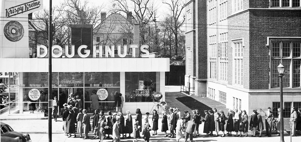 Apesar de existir desde a década de 1930, a Krispy Kreme abriu a sua primeira loja própria quase 50 anos depois, em 1989. A unidade funcionava como uma loja de fábrica e o endereço original era na cidade de Greensboro, na Carolina do Norte, mas já não existe mais.