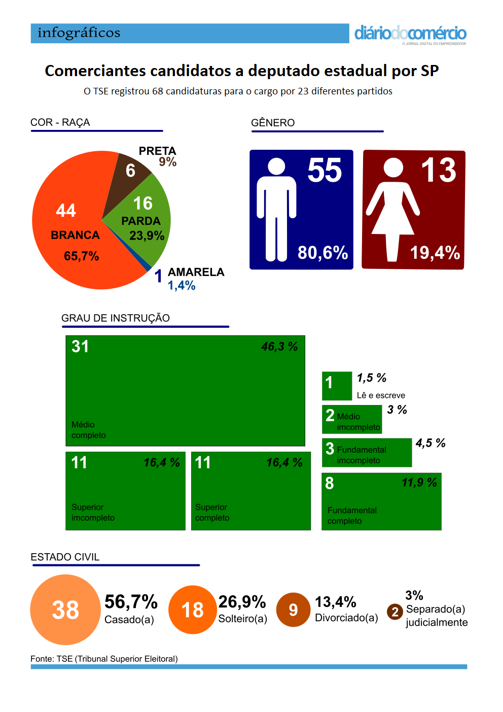 O Tribunal Superior Eleitoral (TSE) registrou a candidatura de 68 comerciantes que concorrem ao cargo de deputado estadual por São Paulo. Desse total, 55 são homens e 13 mulheres, em sua maioria (65,7%) brancos.