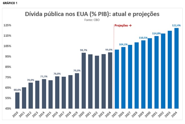 As conclusões não são nada animadoras. O primeiro dos 14 tópicos fala da Vitória Total do republicano (“Presidência, Senado, Câmara, Suprema Corte e voto popular”). O tópico seguinte trata de Aumento do Déficit Público (“Trump promete cortar vários impostos e, com isso, relação dívida/PIB seguirá crescendo”). Um gráfico (imagem 1 abaixo) mostra o comportamento ano a ano desde 2010 (60,6%) até agora (99%) e uma projeção até 2034 (122,4%).