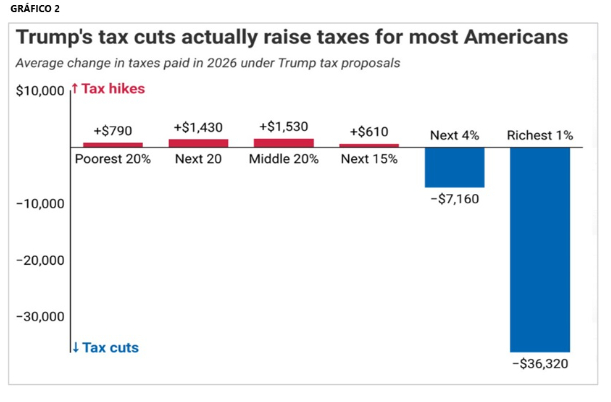 Na segunda página são abordados mais seis tópicos. O primeiro é a Valorização do Dólar (“Maiores taxas de juros nos EUA apreciam a moeda americana e depreciam moedas emergentes; hoje, o real já ultrapassou a barreira de R$/US$ 5,80”). Depois trata de Mais Incerteza (“Devido ao temperamento e postura de conflitos em redes sociais, mundo fica mais imprevisível sob Trump”) e Mais Concentração de Renda (“Estima-se que os cortes de impostos e elevação de tarifas propostas por Trump favoreçam a renda dos 5% mais ricos e prejudicam a renda dos 95% mais pobres”) – este terceiro tópico da segunda página é seguido de um gráfico (imagem 2 abaixo) mostrando que em 2026 pobres pagarão em média mais impostos e os ricos, menos.