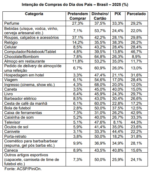 “Em relação ao ano passado, não se observaram variações significativas nas intenções de compra para o Dia dos Pais. Embora tenha diminuído a proporção daqueles que manifestaram disposição a comprar para a data, aumentou a proporção daqueles que desejam gastar mais neste ano, o que poderia sinalizar perspectiva de leve crescimento nas vendas. Apesar do alto grau de endividamento das famílias e dos juros elevados, o mercado de trabalho continua mostrando resiliência, com aumentos de emprego e renda, sustentando a expansão do consumo”, diz Ulisses Ruiz de Gamboa, economista da ACSP.