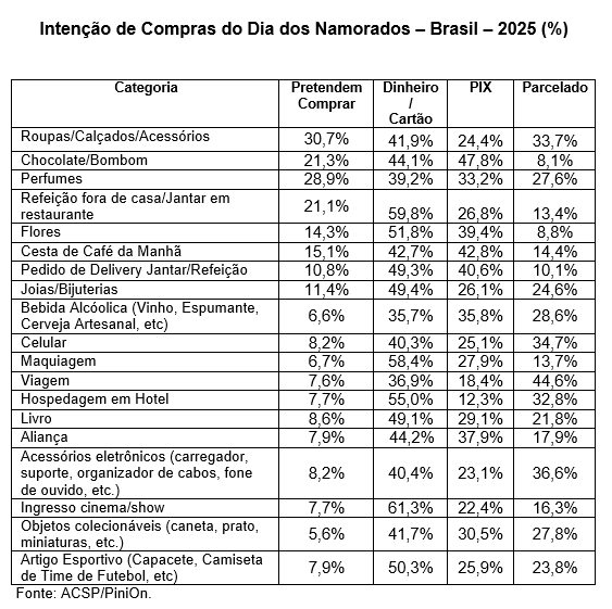 Nas intenções de compra prevalecem presentes de uso pessoal e de menor valor, pagos à vista, o que é típico para a data, ao contrário do Dia das Mães, que também inclui produtos para o lar, como móveis e eletrodomésticos, informa a ACSP.