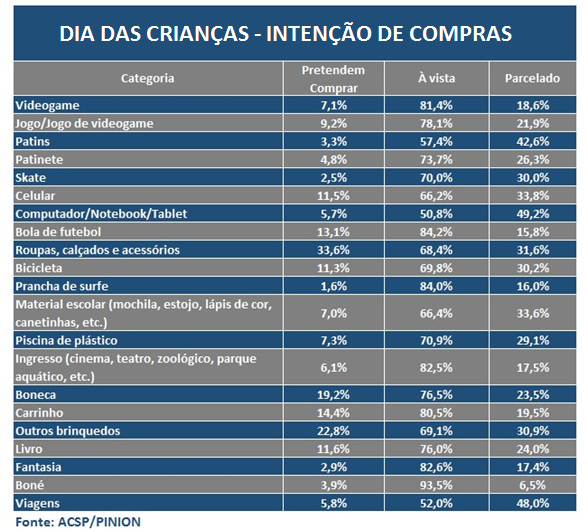 “Em geral, nas intenções de compra captadas prevalecem artigos tradicionais para a data, tais como roupas, calçados e acessórios. Boneca, bola, bicicleta e carrinho não saíram de cena”, comenta Ruiz de Gamboa.