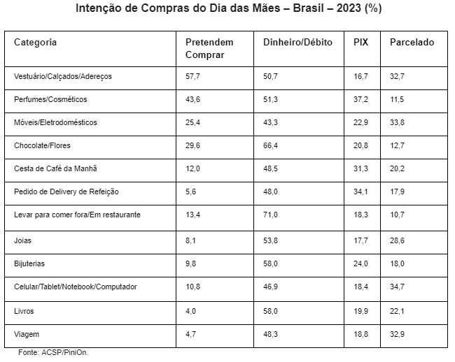 "Em síntese, as intenções de compra para o Dia das Mães apontam para uma maior preferência por artigos de menor valor, menos dependentes do financiamento via crédito e menos relacionados a uma maior permanência nos lares, o que poderia refletir uma volta a hábitos de consumo existentes no período pré-pandemia", analisa.