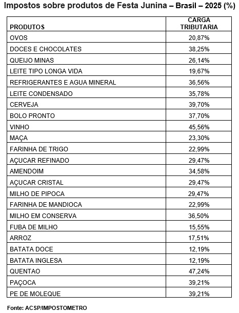 Levantamento da Associação Comercial de São Paulo (ACSP), com base em informações organizadas pelo site do Impostômetro, que é atualizado pelo Instituto Brasileiro de Planejamento e Tributação (IBPT), aponta que produtos de largo consumo no período das festas juninas têm uma carga tributária média de 29,67%.