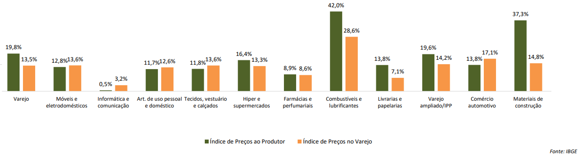 Os setores que conseguiram repassar os custos são: móveis e eletrodomésticos, informática e comunicação, artigos de uso pessoal e doméstico e tecidos, vestuário e calçados e veículos.