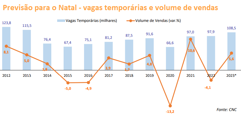 A Confederação Nacional do Comércio (CNC) projeta a contratação de 108,5 mil trabalhadores temporários pelo varejo para dar suporte às vendas de Natal. Se confirmada, essa será a maior oferta de vagas para a data desde 2013, quando foram abertos 115,5 mil postos temporários.