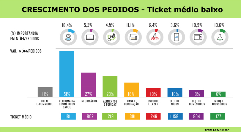 As categorias responsáveis pela expressiva alta de pedidos no m-commerce são Perfumaria, Cosméticos e Saúde (com 51% de crescimento), Informática (27%), Alimentos e Bebidas (23%), além de Moda e Acessórios (+6%), Esporte e Lazer (+10%) e Casa e Decoração (+16%).