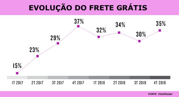 A porcentagem de lojas que utilizaram frete grátis como estratégia apresentou leve variação durante o ano de 2018. Ao analisar os dez maiores players do mercado, esse aumento acontece em dois momentos: no segundo e no quarto trimestre do ano devido à greve dos caminhoneiros e período de Natal (que inclui Black Friday), respectivamente.