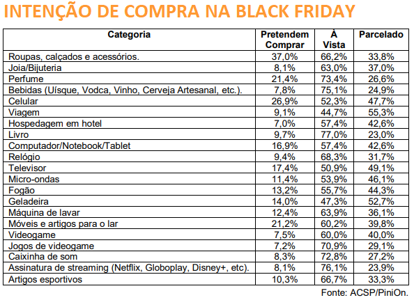 Ruiz de Gamboa lembra que, tradicionalmente, artigos eletroeletrônicos apresentam a maior intenção de compra durante a Black Friday, mas que itens de uso pessoal seguem se destacando. “Isso pode estar relacionado ao fato de os produtos terem valores menores, mais acessíveis, considerando um contexto de situação financeira ainda relativamente difícil”.