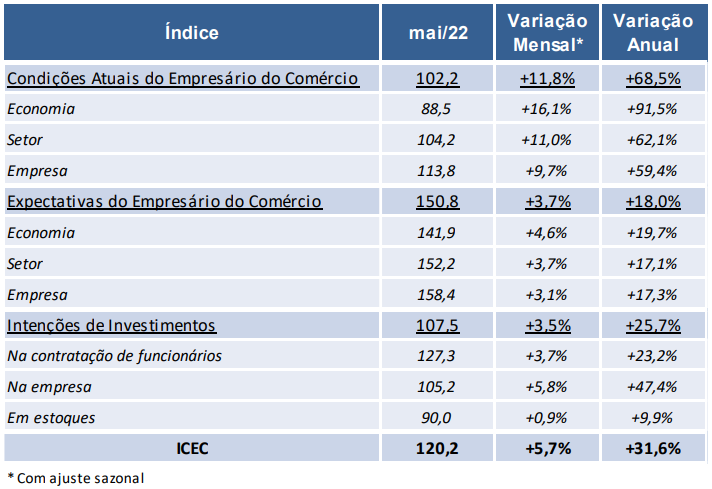 O índice de Confiança do Empresário do Comércio (ICEC) registrou alta de 5,7% na passagem de abril para maio, chegando aos 120,2 pontos, o maior patamar desde dezembro de 2021. Este indicador varia de zero a 200 pontos, sendo que resultados acima de 100 pontos evidenciam otimismo.