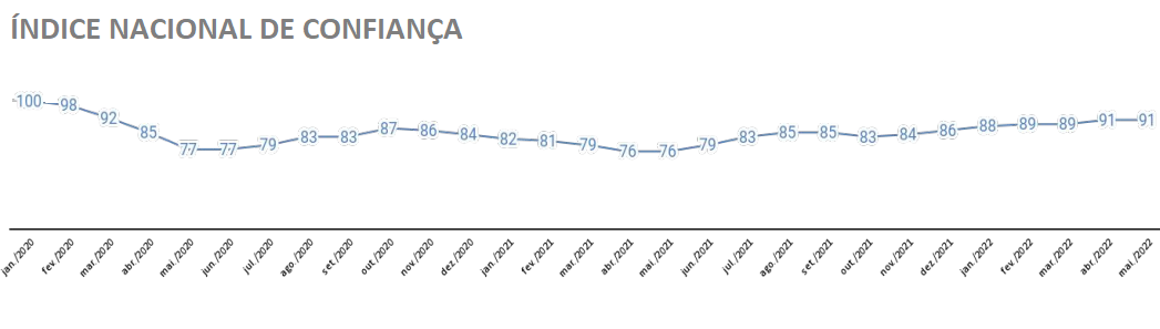 Nesse contexto, o Índice de Confiança do Consumidor Brasileiro, da Associação Comercial de São Paulo (ACSP), oscilou apenas 3 pontos para cima de janeiro, quando registrava 88 pontos, até maio, quanto bateu os 91 pontos. Destaca-se que, pela metodologia da ACSP, resultados abaixo dos 100 pontos denotam pessimismo do consumidor.