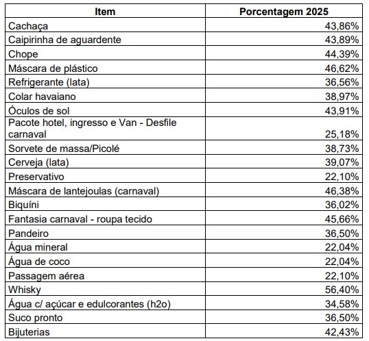 Confira na tabela abaixo a carga tributária incidente sobre itens típicos de Carnaval levantados pela ACSP: