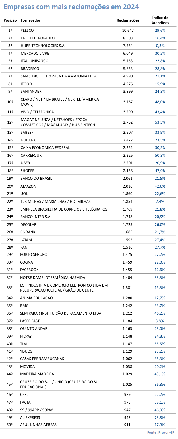 Os registros do Procon-SP mostram 10.647 reclamações direcionadas à Yeesco, sendo que 29,6% das demandas feitas à empresa foram atendidas. Na sequência aparecem a Enel, com 8.508 reclamações (16,4% atendidas), que tem enfrentado problemas para manter o fornecimento de energia elétrica na cidade de São Paulo, e a agência de viagens online Hurb Technologies, que teve 7.554 reclamações registradas no Procon paulista, sendo também a empresa com o menor índice de demandas atendidas, apenas 0,3%.