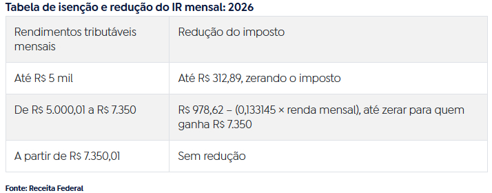 As alterações valem para os salários pagos a partir de janeiro, com impacto percebido a partir do pagamento de fevereiro. As mudanças se refletirão na Declaração do Imposto de Renda Pessoa Física de 2027, que considera os rendimentos de 2026.