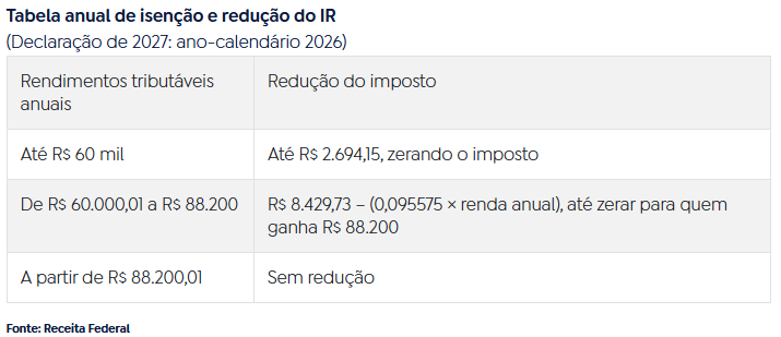 - isenção anual para quem ganhar até R$ 60 mil em 2026;