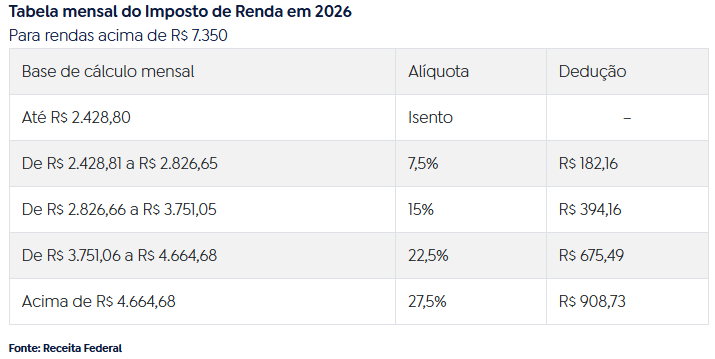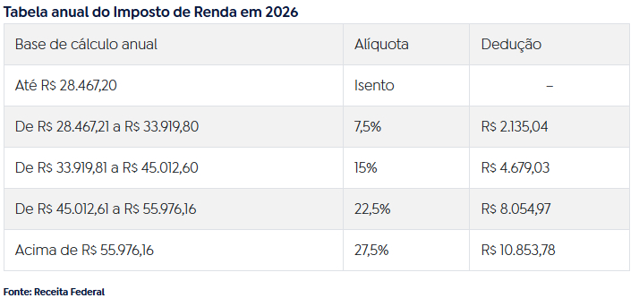 A tabela tradicional do Imposto de Renda não foi alterada, continuando os valores em vigor em 2025. A diferença está nos redutores adicionais instituídos pela reforma do IR.