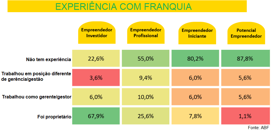O perfil predominante foi denominado pela ABF como Empreendedor Iniciante, que compõem 39% da amostra. Já o Empreendedor Profissional corresponde a 29% do total, seguido pelo Potencial Empreendedor (16%) e pelo Empreendedor Investidor (15%).