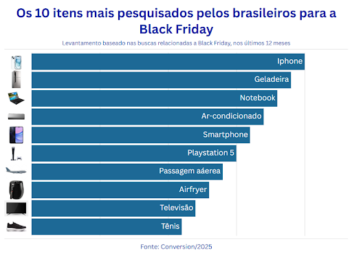 O levantamento pela Conversion também mostrou quais foram os itens mais procurados e que estão atrelados à busca por descontos no evento global. Para os brasileiros, os produtos que mais despertam o interesse na Black Friday são iPhone, geladeira, notebook, ar-condicionado, smartphone, PlayStation 5, passagens aéreas, air fryer, televisão e tênis. Ou seja, são produtos com valor potencialmente elevado no restante do ano, e que tendem a ter bons descontos na data promocional.