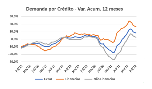 A despeito dessas diferenças, as curvas de longo prazo de ambos os indicadores se mantiveram numa trajetória de desaceleração. O crescimento no segmento "Financeiro" passou de 17,4% para 16,8% e no segmento "Não Financeiro" de 3,6% para 2,7%. O ritmo de desaceleração pode ter sido mais tímido em julho em comparação aos meses anteriores, mas nada sugere que essa tendência será revertida nos próximos meses.