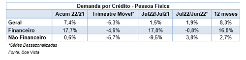 O indicador de Demanda por Crédito do Consumidor, medido pela Boa Vista, subiu 1,9% entre os meses de junho e julho na comparação dos dados dessazonalizados. O resultado praticamente reverteu a queda observada no mês de junho, de mesma magnitude, e pôs fim a uma sequência de três quedas consecutivas na mesma base de comparação. Porém, o efeito das quedas anteriores prevaleceu na comparação do trimestre móvel findo em julho contra o trimestre findo em abril, tanto que o indicador recuou 5,3% nesse período.