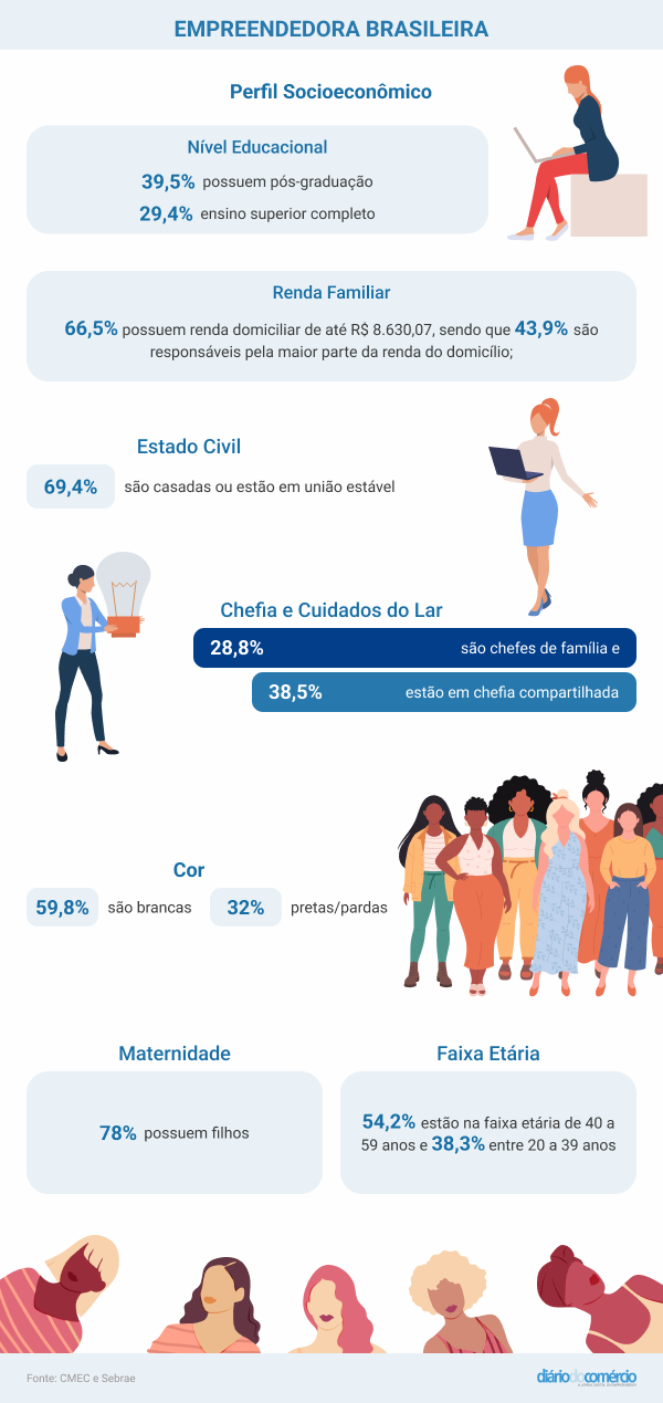 Beleza (16,7%), alimentação (16,3%), vestuário (15,2%) e saúde (14,4%) são os principais ramos de atuação dessas mulheres. Sendo que 18,9% das entrevistadas indicaram atuar em mais de um ramo.
