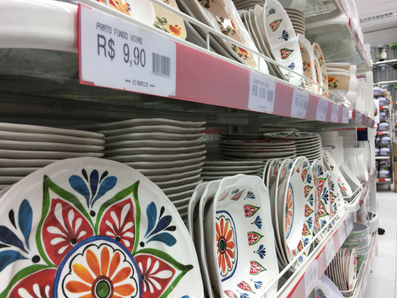 A diferença é que a Econômica decidiu se concentrar em utensílios domésticos, como potes, pratos, plásticos, escorredores para louça, talheres, um sortimento pequeno de brinquedos e artigos de papelaria.
