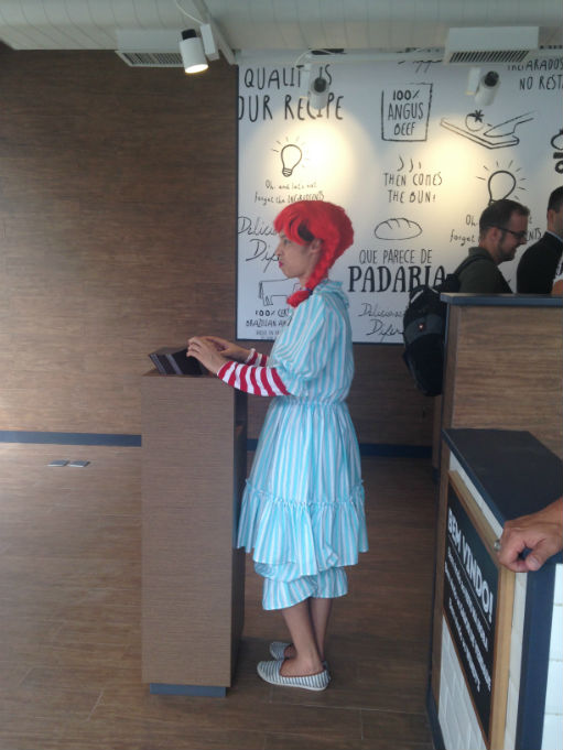 Funcionária com fantasia do logotipo da marca se prepara para receber os clientes