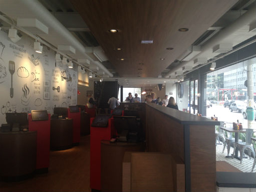 Após concluído, ele recebe um ‘pager’ e retorna à mesa. Assim que o prato fica pronto, um funcionário o leva até a mesa. O tempo de atendimento previsto para entrega dos sanduíches é de 2 minutos.