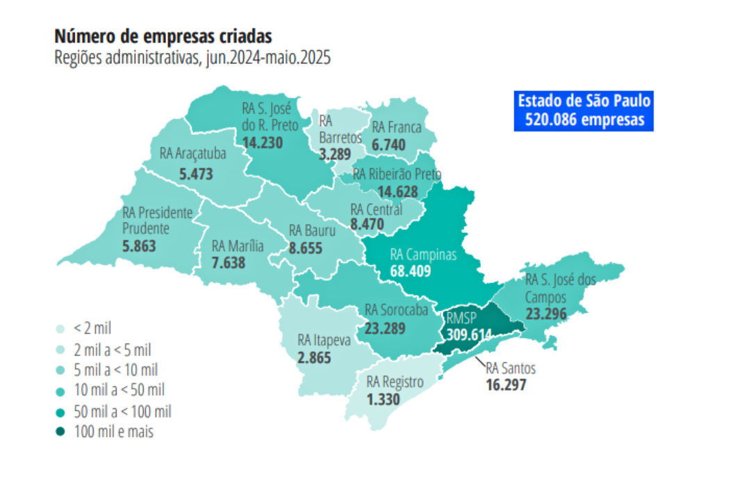 O Estado de São Paulo registrou a abertura de 520.086 empresas no acumulado dos últimos 12 meses (junho de 2024 a maio de 2025), de acordo com dados de CNPJ disponibilizados pela Secretaria Especial da Receita Federal e compilados pela Fundação Seade.