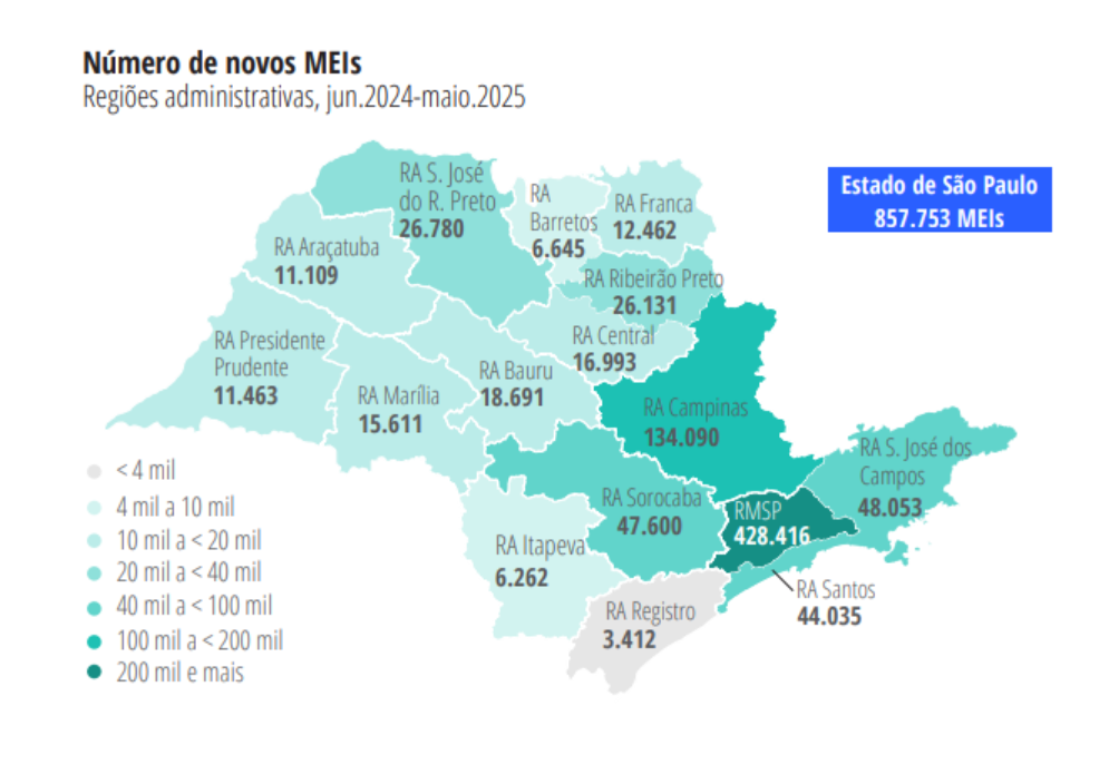 A região metropolitana de São Paulo (RMSP) foi responsável pela geração de 428.416 novos MEIs, 49,9% do total estadual. Em seguida, apareceram as RAs de Campinas (134.090), São José dos Campos (48.053), Sorocaba (47.600) e Santos (44.035). Outras regiões de destaque foram São José do Rio Preto (26.780), Ribeirão Preto (26.131) e Bauru (18.691).