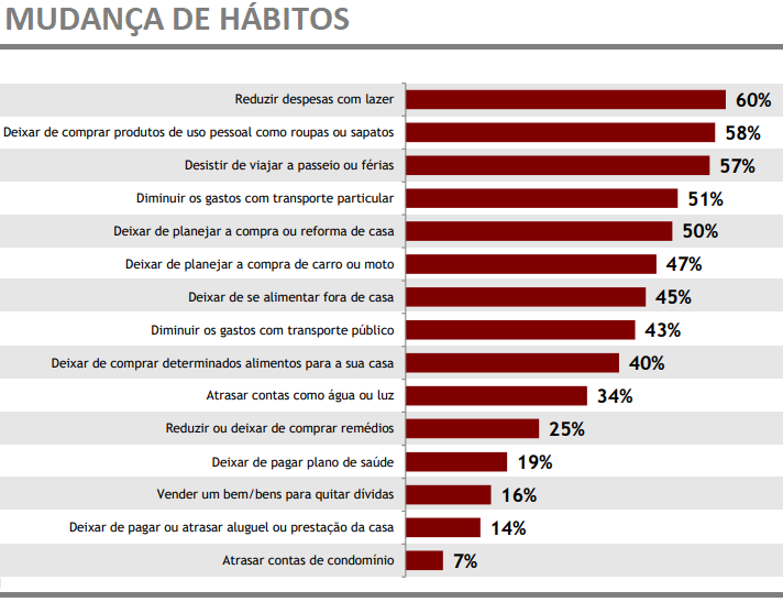 Ainda assim, cortes no consumo precisaram ser feitos. Com o orçamento apertado, a redução de despesas com lazer foi apontada por 60% dos entrevistados. Em seguida, aparece a diminuição de gastos com itens pessoais, como roupas e calçados, apontada por 58%.