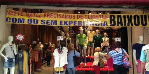 De uma maneira bem humorada, a Outfashion estampou um apelo em uma faixa na fachada da loja: “Neste Natal, precisamos de clientes, com ou sem experiência”.
