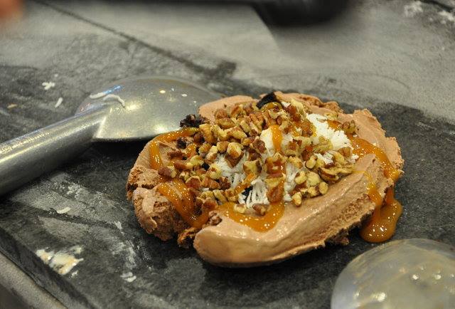 A inauguração da franquia americana Cold Stone Creamery, em Moema, na zona sul, há 1 ano e meio, diversificou as opções da capital. Aos finais de semana, não tem jeito. Sempre tem fila. Uma boa oportunidade para pensar na combinação escolhida. A proposta é servir uma sobremesa personalizada. O cliente escolhe a base, por exemplo, sorvete de creme, e adiciona os ingredientes que quer colocar na massa, como frutas, pastas e castanhas. A mistura é feita em uma pedra de granito congelada a -3 graus.