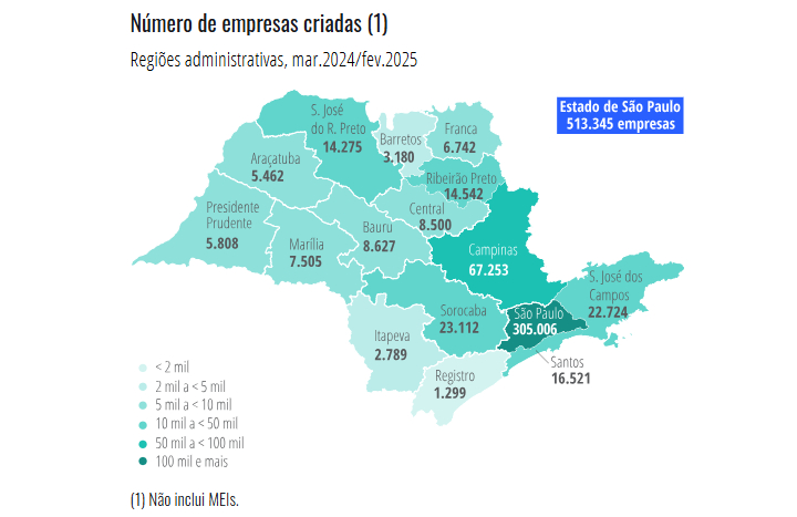 A Região Metropolitana de São Paulo liderou a criação de empresas no acumulado dos últimos 12 meses, com 305.006 novas empresas, 59,4% do total do Estado. Na sequência, destacaram-se as Regiões Administrativas (RAs) de Campinas (67.253 empresas); Sorocaba (23.112); e São José dos Campos (22.724). Outras regiões de destaque foram Santos (16.521), Ribeirão Preto (14.542), São José do Rio Preto (14.275) e Bauru (8.627).