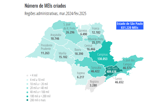 A Região Metropolitana de São Paulo registrou o maior número de MEIs no período, com 409.638 registros, 49,3% do total estadual. Em seguida, apareceram as RAs de Campinas (130.053), Santos (46.652), São José dos Campos (46.572) e Sorocaba (46.422). Outras regiões de destaque foram São José do Rio Preto (26.296), Ribeirão Preto (25.371) e Bauru (18.390).