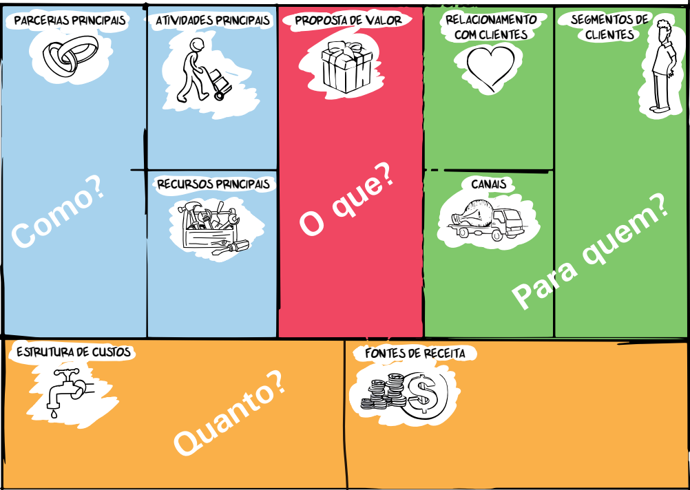 O quadro do Canvas consiste em oito blocos, campos que o empreendedor precisa preencher. São eles: