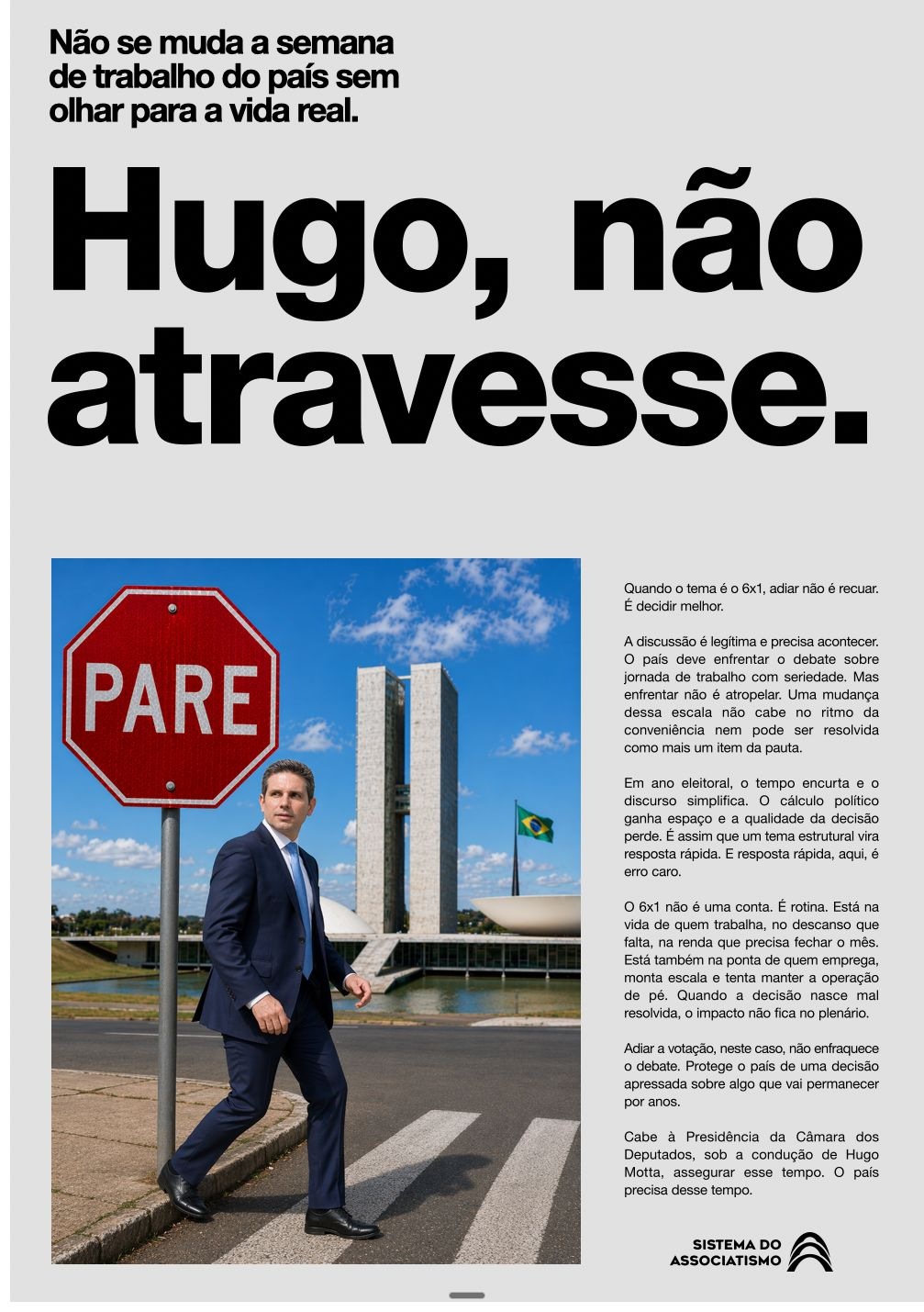O sistema associativista das associações comerciais iniciou uma campanha cobrando de Hugo Motta, presidente da Câmara dos Deputados, o adiamento da votação de propostas que buscam acabar com a escala de trabalho 6x1.