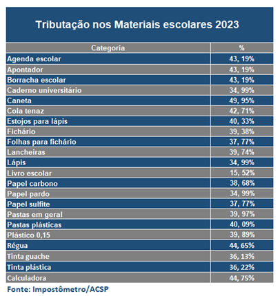 Em grande medida, o que encarece o material escolar são os tributos embutidos em seus preços, que em alguns casos, como no da caneta, equivalem à metade (49,95%) do preço final do produto.