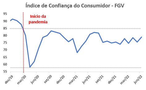 Outro dado que ajuda a refletir um pouco disso é a confiança dos consumidores apurada pela FGV. O Índice de Confiança do Consumidor oscilou bastante no 1º semestre, está 3,5 pontos acima da marca registrada em dezembro de 2021, mas ainda abaixo do nível observado antes da pandemia.