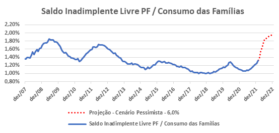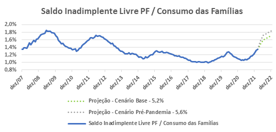 Agora, de volta ao problema, dado o “combo” citado anteriormente, essa relação tende a superar os patamares verificados noutras crises. Fazendo um exercício rápido de simulação e considerando i) um crescimento anual de 17% na carteira de crédito livre às pessoas físicas, ii) uma elevação de 1,7% no Consumo das Famílias em 2022, ambos adiantados pelo diretor de política monetária do Banco Central, Diogo Guillen, e iii) diferentes níveis para a taxa de inadimplência ao final do ano, de 5,2% (cenário base) e de 5,6% (nível pré-pandemia), teríamos: