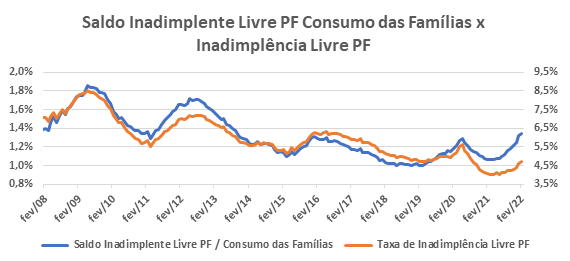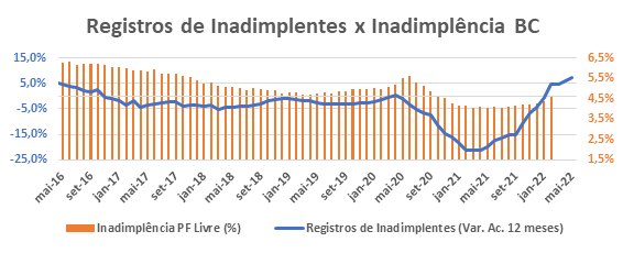 Falando em dados, só para citar alguns deles, o indicador de Registros de Inadimplentes da Boa Vista acumulou alta de 12,4% de janeiro a maio de 2022 em comparação ao mesmo período de 2021. Na análise acumulada em 12 meses, a trajetória de crescimento acelerado da curva de longo prazo também aponta para um aumento da taxa de inadimplência das famílias com recursos livres.