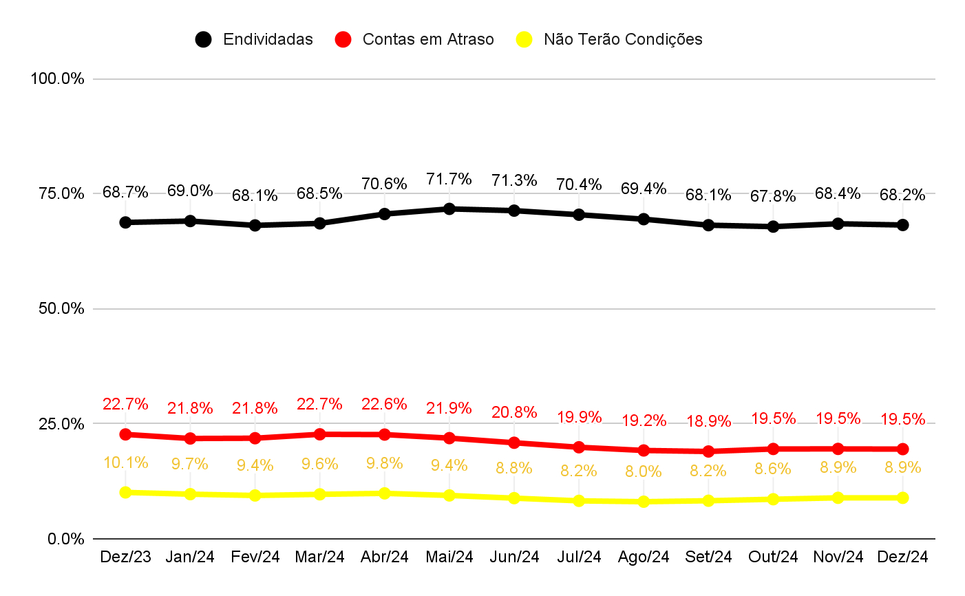 O estudo mostra ainda que 8,9% dos lares endividados em dezembro do ano passado relataram que não teriam condições de quitar suas dívidas. O percentual foi o mesmo de novembro, mas caiu em relação a dezembro de 2023, quando 10,1% das famílias informaram ser incapazes que pagar o que deviam.