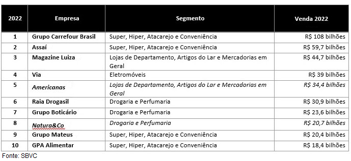O Carrefour lidera a lista, com um faturamento bruto de R$ 108 bilhões – e é a primeira empresa do varejo brasileiro na história a ultrapassar a marca dos R$ 100 bilhões em vendas anuais. As 5 maiores empresas do Ranking (Carrefour, Assaí, Magazine Luiza, Via e Americanas) somaram um faturamento de R$ 285,9 bilhões, ou 27,33% do faturamento das 300 maiores, e 10,95% do faturamento total do Varejo Ampliado brasileiro.